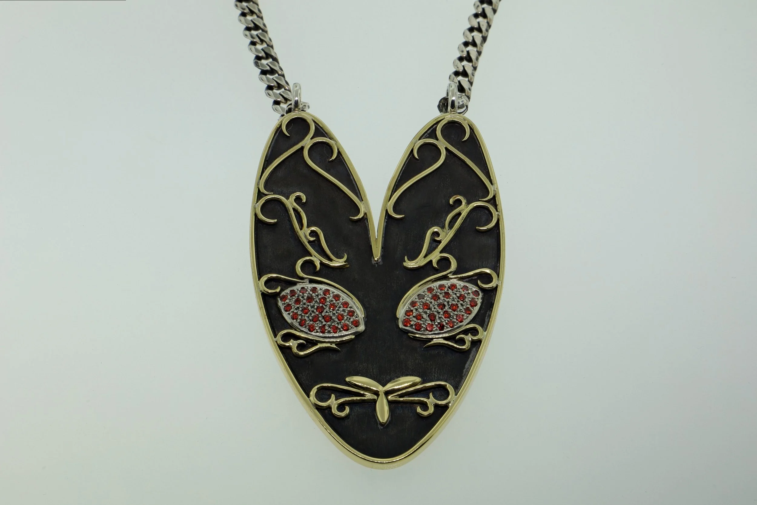 The mk ll version was designed to be much lighter than its predecessor. It was made with a blackened sterling silver base with an 18 carat yellow gold border, 18 carat yellow gold filigree on one side and black enamel on the other. The eyes contain pave set red and white, diamond cut cubic zirconia’s.